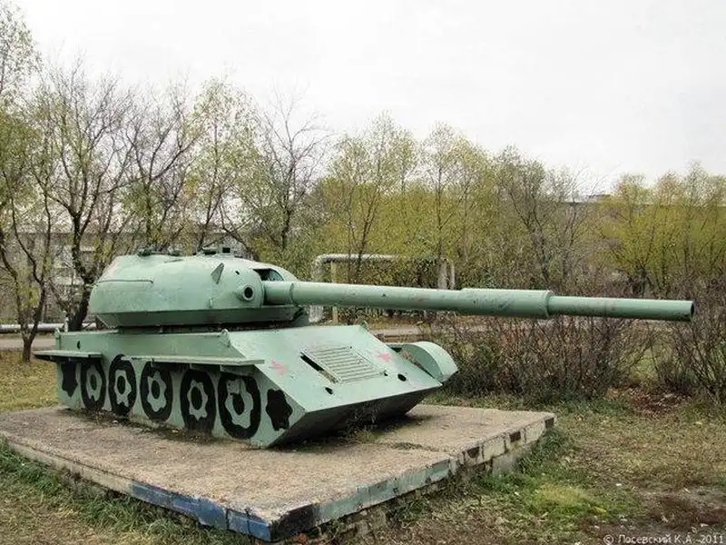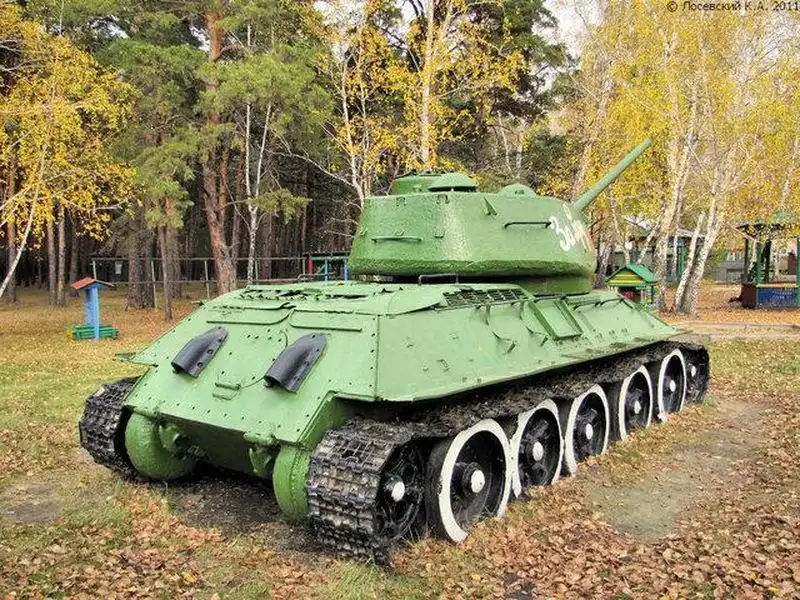 Этот Т-34-85 находится в лагере "Спутник", надо сказать, что гораздо более тематичнее он бы смотрелся в находящемся неподалёку лагере "Искорка", относящемуся к заводу Транспортного машиностроения им. Октябрьской революции, который как раз и выпускал такие танки с 1944 по 1946 г. Но увы, в Искорке почему-то танка нет, наверное, чтобы враг не догадался. :)
