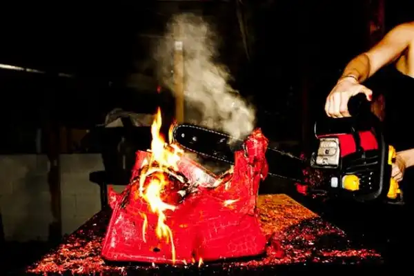 Сумочка Hermes Birking из крокодильей кожи стоимостью $100.000 была зверски уничтожена. Сначала ее обработали бензопилой, а потом просто сожгли...