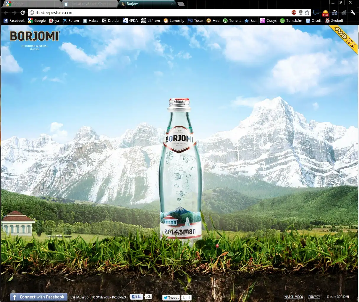 Тема поста была следующей: Самый глубокий сайт и под катом только видео. Суть увиденного меня потрясла и рассмешила. Не вдаваясь в подробности я поспешил на сайт. Ссылка была любезно предоставлена. На сайте в натуральную величину изображена бутылка мин. воды Боржоми, которая стоит напротив великолепного горного пейзажа...