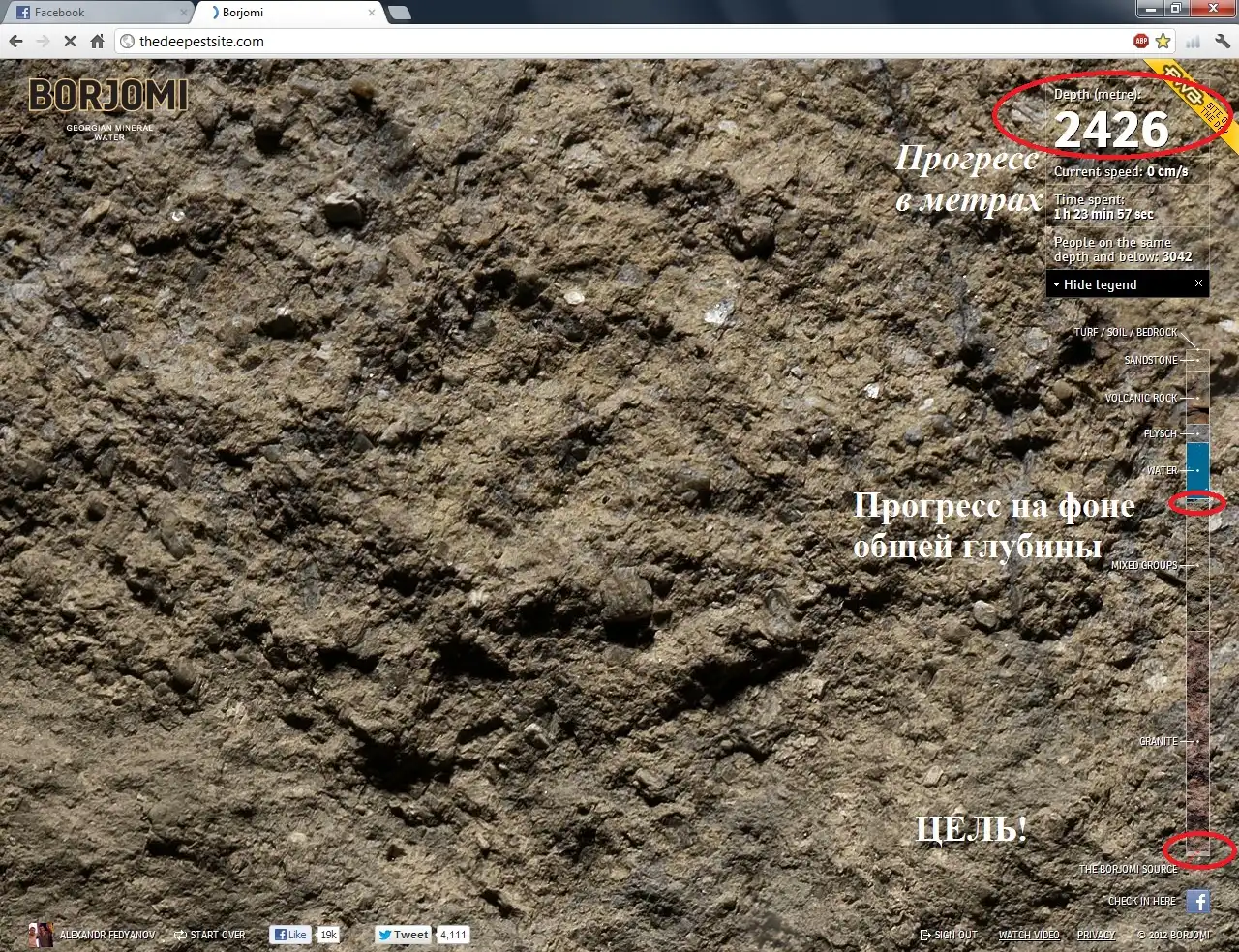 Прошло около 15 минут скроллинга и я, взглянув в правую колонку, где виден прогресс, ужаснулся... А цифра указывающая общую глубину "сайта" (глубину с которой якобы берут воду для мин. воды) погрузила в отчаяние. Глубина около 8000 м!