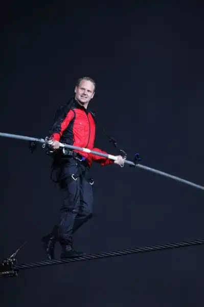 Ник Валленда представитель седьмого поколения в семье знаменитых цирковых артистов, известном, как – Flying Wallendas (Летающие Валленды ). За свою карьеру 32-летний канатоходец побил несколько мировых рекордов и удерживает рекорд Гиннеса, по самому длинному и высокотному проезду по канату на велосипеде.