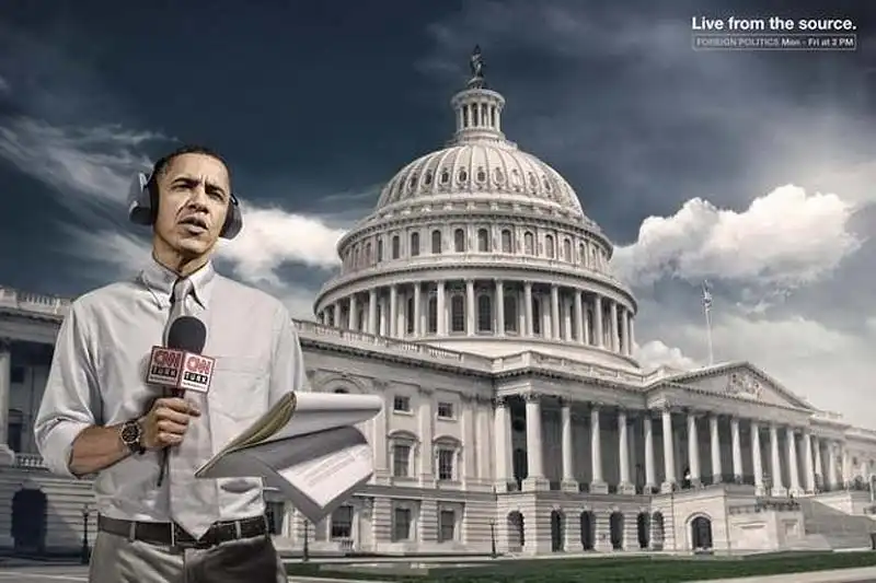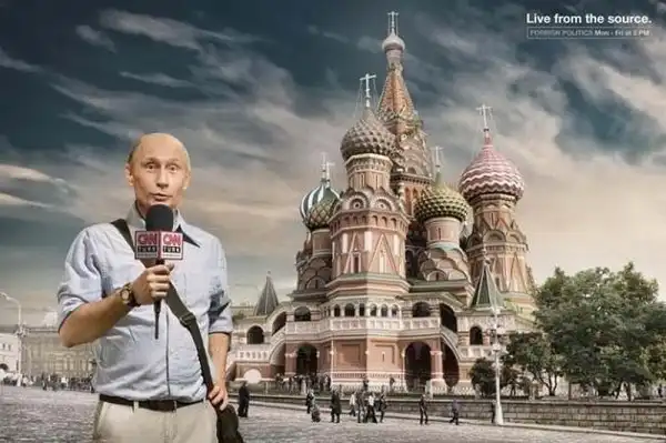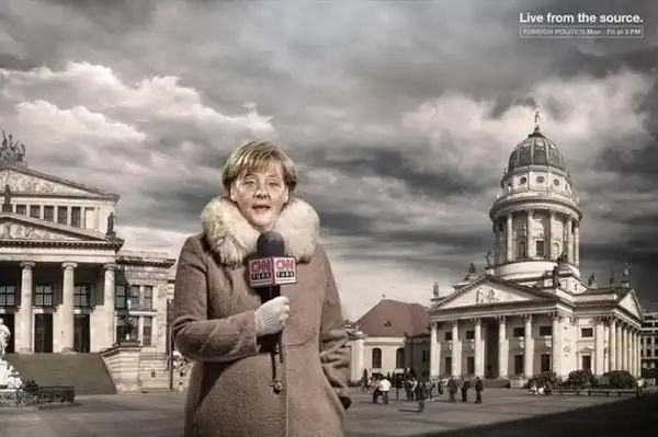 Принты рекламной кампании Live from the source для телекомпании CNN, на которых изображены национальные лидеры России, США, Франции и Германии в роли корреспондентов CNN.