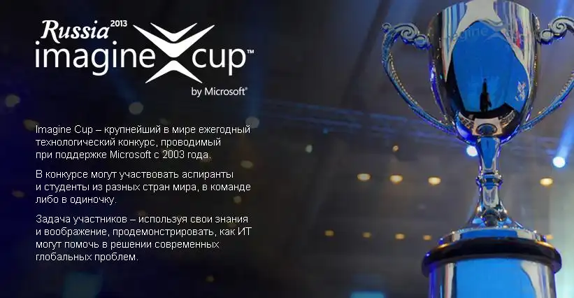 Imagine Cup - крупнейший в мире ежегодный технологический конкурс, проводимый при поддержке Microsoft. В конкурсе могут участвовать аспиранты и студенты из разных стран мира, в команде или индивидуально. Ваша цель - используя свои знания и креативные способности, продемонстрировать, как технологии могут помочь в решении современных глобальных проблем.