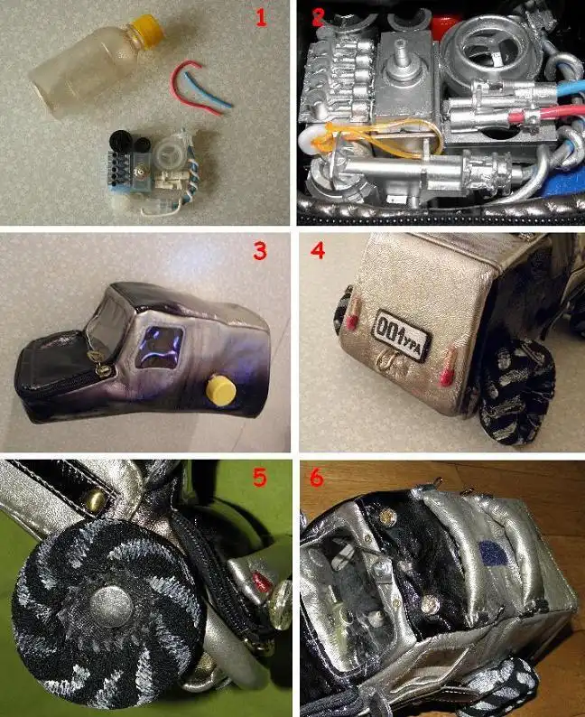 Вшиваем в капот молнию от сумки, лишнее отрезаем. Вклеиваем внутрь наш мотор. Также из пластика прозрачного цвета вшиваем "стёкла". Вклеиваем бензобак.(Фото3).