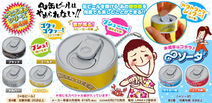 Собственно в этом бесконечном открывании со звуковым сопровождением и есть весь смысл Mugen Beer. Через каждые 30 «открытий» обещан голосовой сюрприз. Например, из ёмкости донесётся «я хочу пить». Впрочем, ещё банки могут служить оригинальным брелоком (цепочка идёт в комплекте).