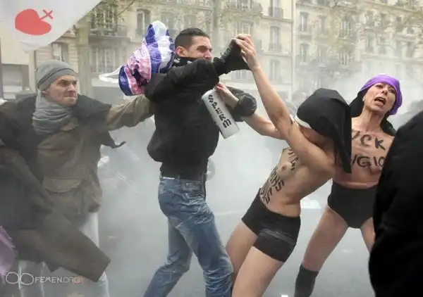 Около десятка девушек с обнаженной грудью, частично одетые в костюмы монашек, появились перед протестующими против легализации однополых браков и начали выкрикивать лозунги вроде "Мы верим в геев" (In gay we trust по аналогии с "In God we trust" - мы верим в бога). Девки также засыпали демонстрантов белым порошком.