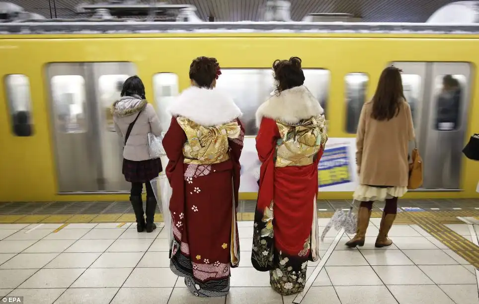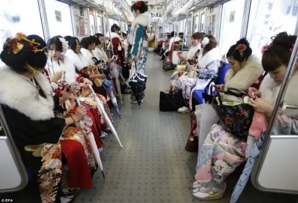 Юные Японки не слишком расковано выглядят в общественном транспорте, возвращаясь домой после церемонии.