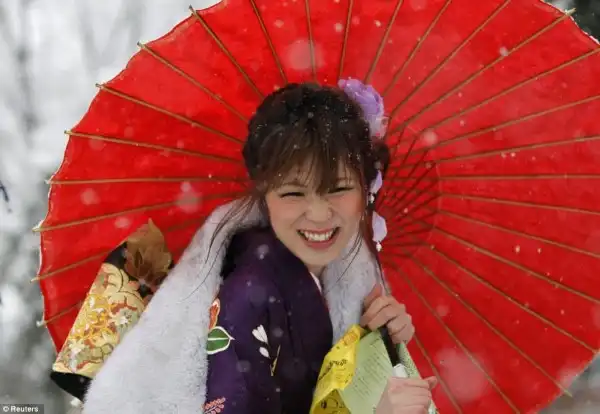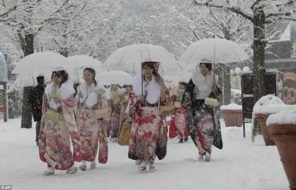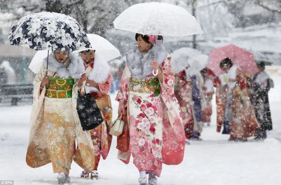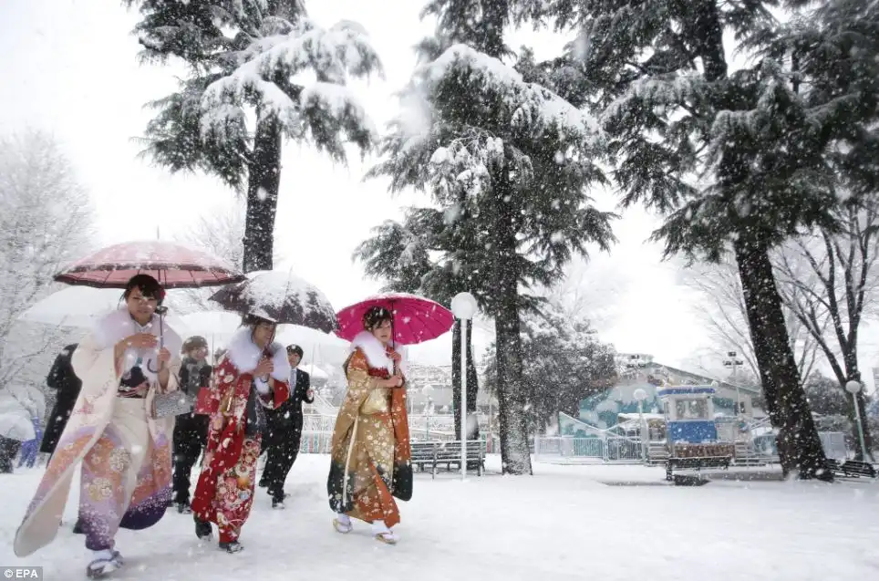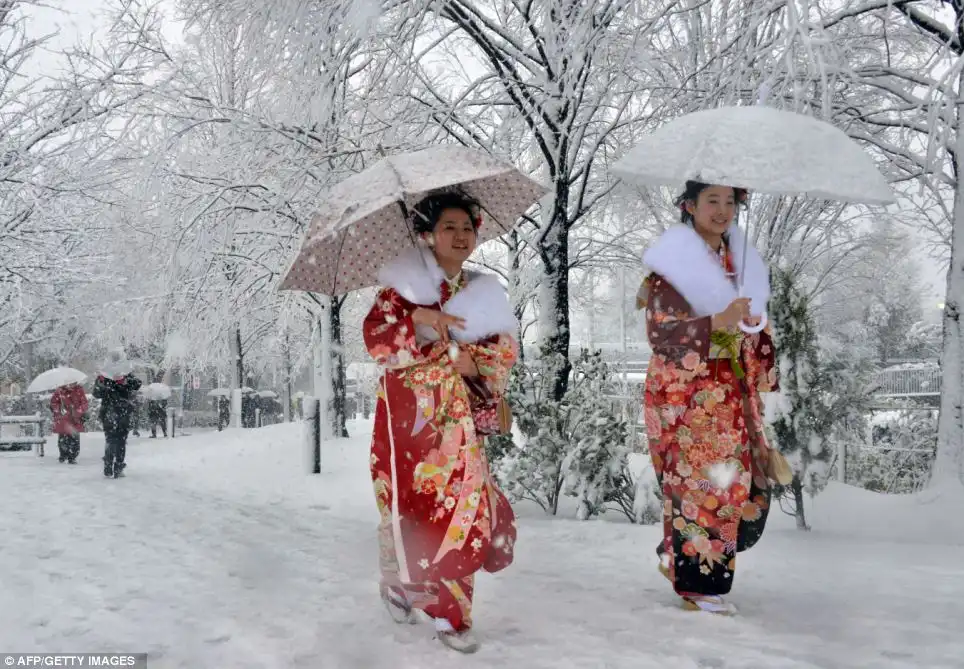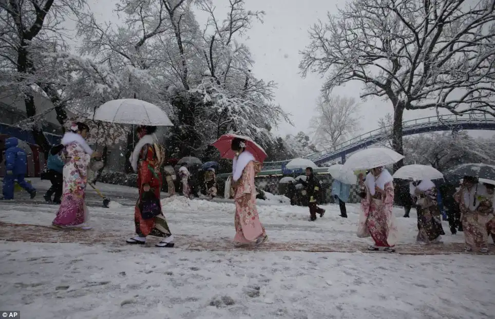 Движение перекрыто: Рейсы в столичном аэропорту Ханэда отменены, скоростные магистрали частично закрыты, а отправление поездов откладывается из-за снегопада. Но девушек в кимоно это не останавливает.
