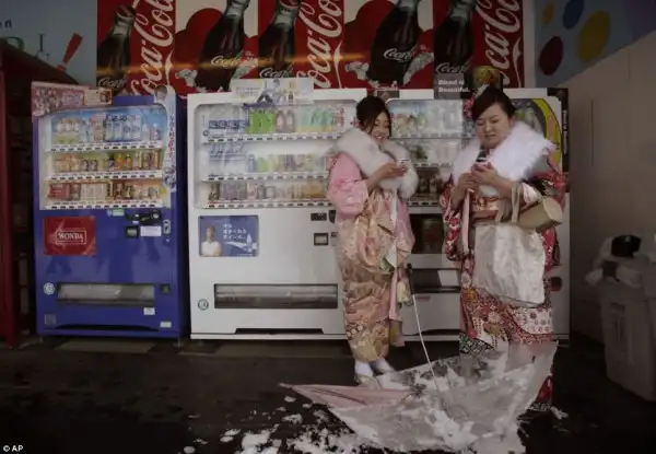 Традиции и современность: девушки надевают традиционные кимоно Фурисодэ, стоимость которых может превышать $10.000, и сандалии гэта, но уже никак не могут обойтись без своих мобильных телефонов.