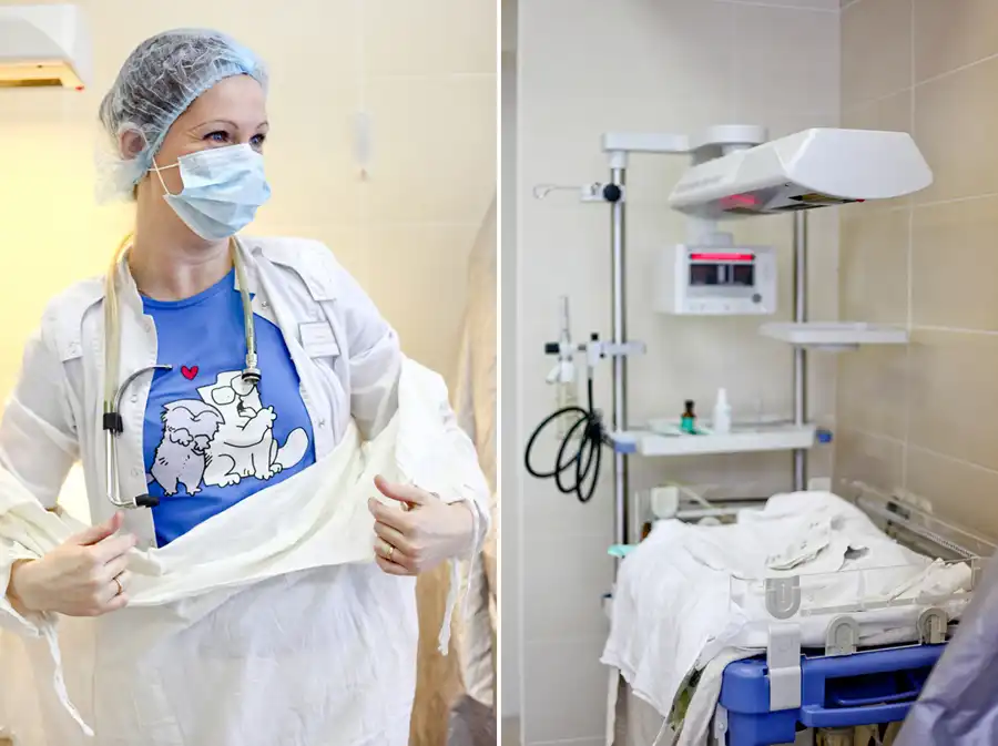 Детский врач с котом Саймона и ее рабочее место. В этой люльке малыш пройдет свой первый медосмотр.