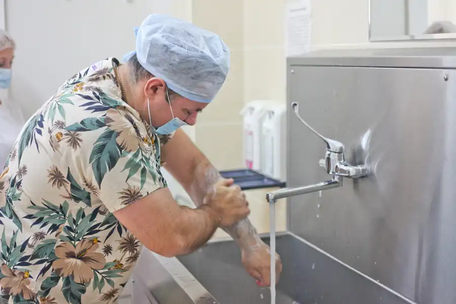 У Сергея Феликсовича душевный костюм. Он надевает бахилы, моет руки с мылом, потом обрабатывает антисептиком.