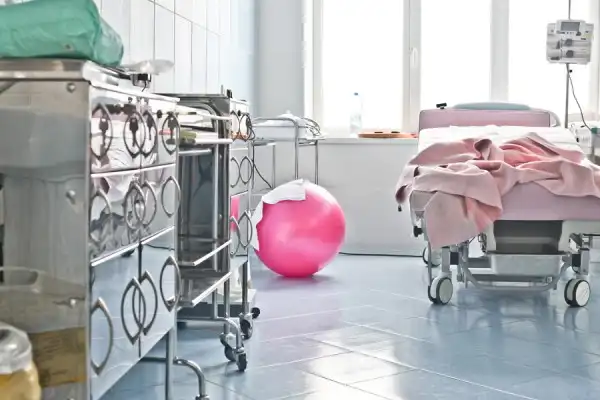 Это родовой бокс. Туда отправляется роженица в период частых схваток. Можно на фитболе поколбаситься: опытные мамы утверждают, что это помогает расслабиться. В боксе есть столик для новорожденного, душ или ванна.