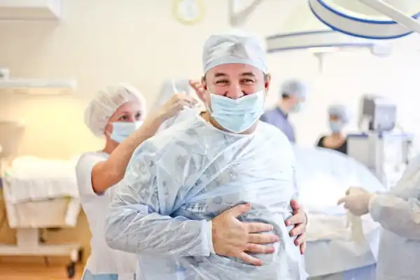 В дверях операционной сестры помогают ему одеться в стерильный наряд. Очень он тут похож на героя Леонова, директора детского сада, в "Джентльменах удачи"!