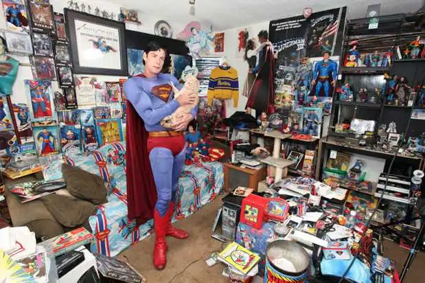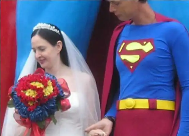 45-летний Деннис Кристофер собрал более 15 000 различных предметов, включая покрывала, модели и игрушечные машинки, украшенные литерой “S” или лицом Кларка Кента. Но, несмотря на то, что пара связала себя узами брака на тематической свадьбе (темой которой конечно же стал супергерой), пара уже успела развестись. 45-летний мужчина, который работает двойником Кристофера Рива, надевал для брачной церемонии костюм Супермена. Сочетались браком молодожены под 4,5-метровой статуей героя.