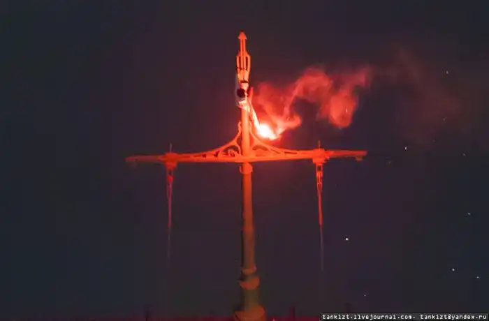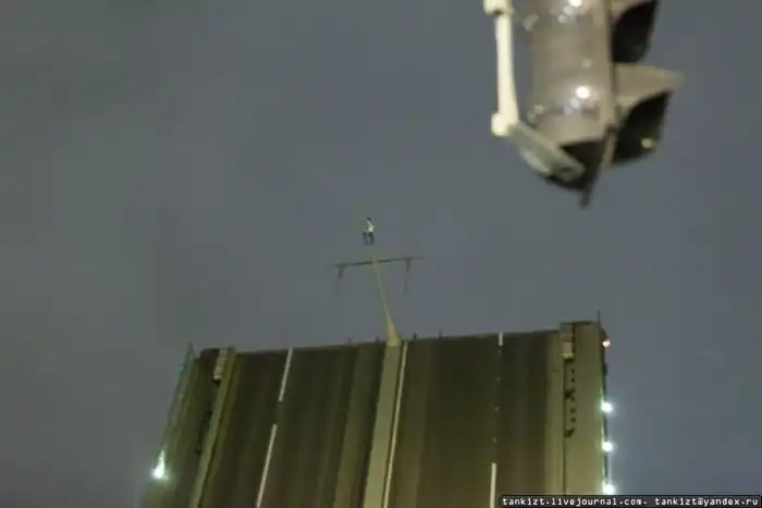 Мост озаряется ярким отблеском файера и только тогда охрана его замечает, действительно, столько людей не каждый день тычат пальцами на разведённый мост, да и фаера конструкцией данного сооружения не предусмотрены.