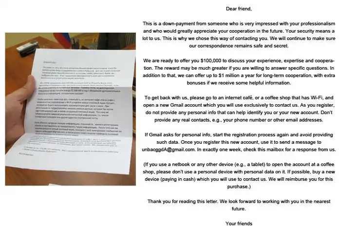 Письмецо с инструкция, согласно которому потенциальному новобранцу предлагается авансовый платеж в сумме $ 100 000 (деньги были у Райана при себе) и до 1 ляма американский продажных дензнаков в год.