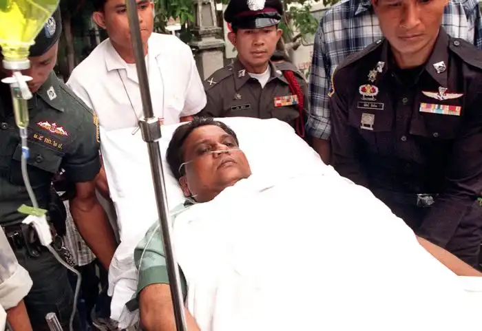 Полиция сопровождает в уголовный суд Бангкока индийского криминального авторитета Раджендру Никалдже по кличке «Маленький Раджан» (Чхота Раджан) после покушения на него. 28 сентября 2000 года.