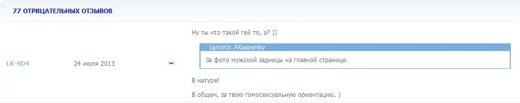 20948 78.140.12.51 LK-4D4 23 июля 2013 23:56 мне вот ваще пох, я тут ничего такого о себе не писал, и тем более что я гей. я хз с чего