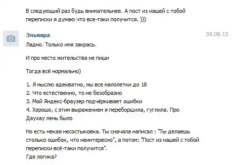 Думал уже ничего интересного не будет... попращались и на том конце успокоятся... Даже расстроился немного, что так и не выхватил лулзов. Но! На следующее утро "она" опять пишет. Продолжаем общение... Тут я решил стать немного поагрессивнее и подкинуть пищи для разводил. )))