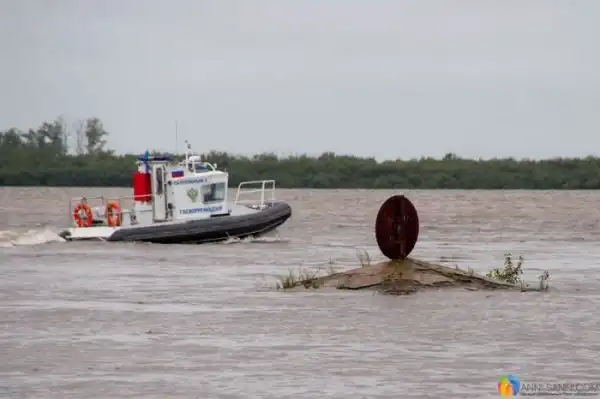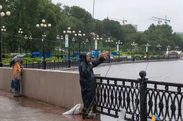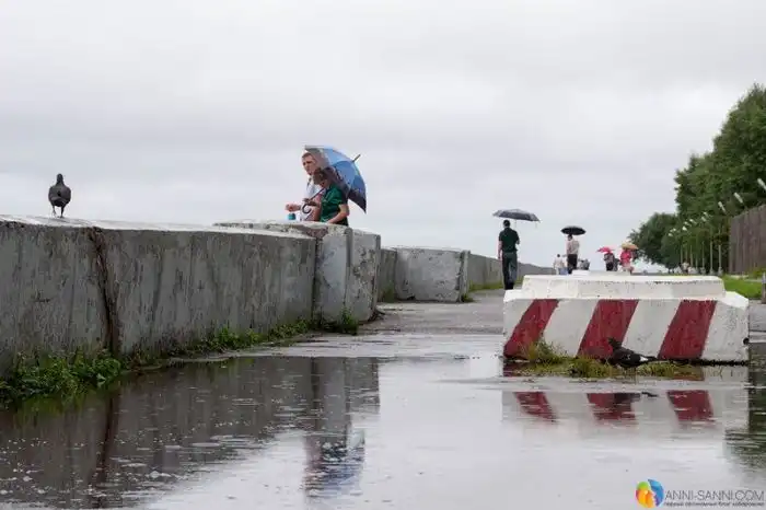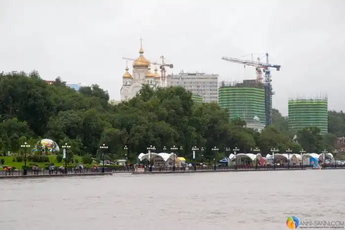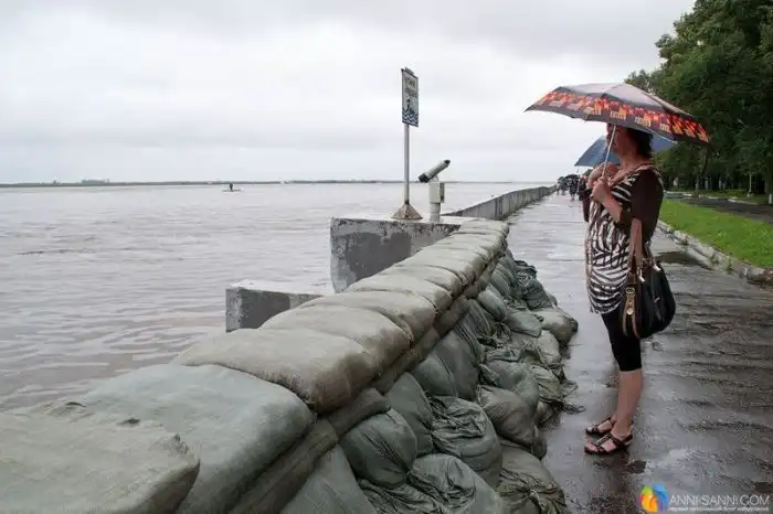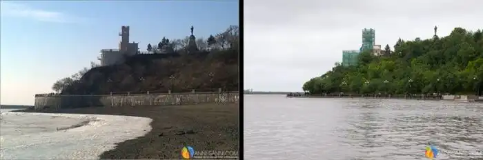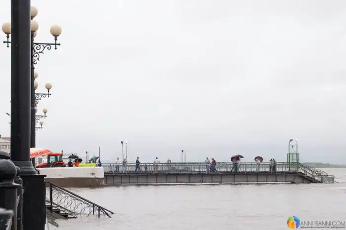Дебаркадер, на котором находилась таможня и откуда отправлялись суда в Фуюань, сняли с прикола и отбуксировали куда-то. На переходе к нему, символично уходящем под воду, толпятся люди, фотографирующие набережную.