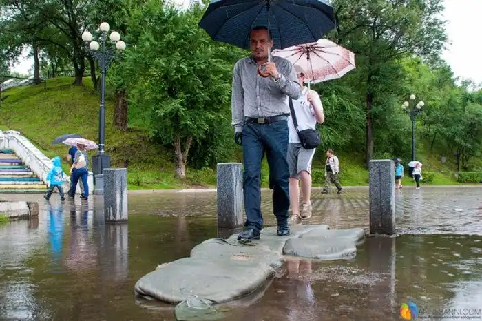 Мешки используются и как "мостики" в лужах. Впрочем, на этом месте -в районе Цветной лестницы - вскоре после обеда возвели сплошную дамбу в метр высотой из мешков, но когда мы были на Набережной, ее еще не было.