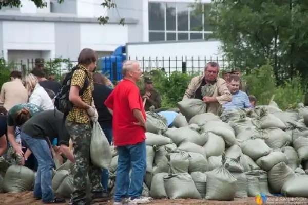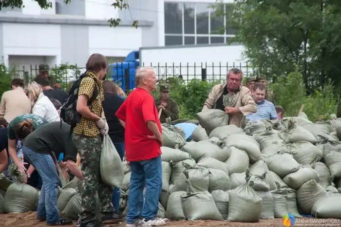 Волонтеры, помогающие защищать уже частично подтопленную улицу Юнгов. находящуюся неподалеку.