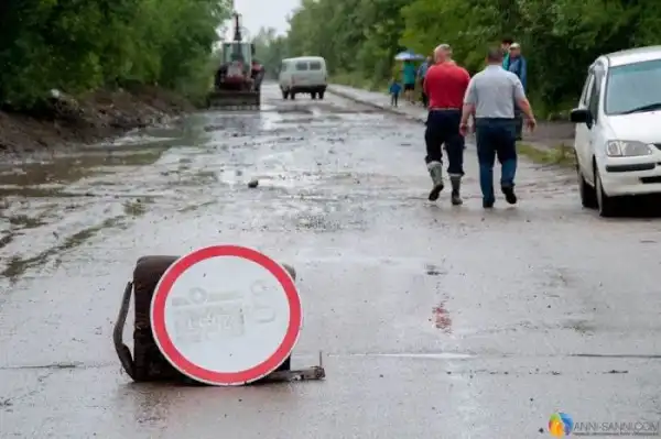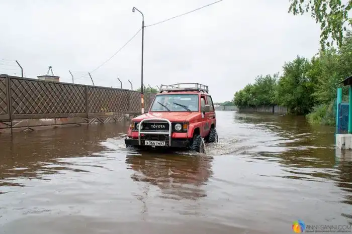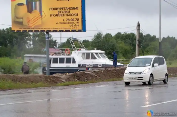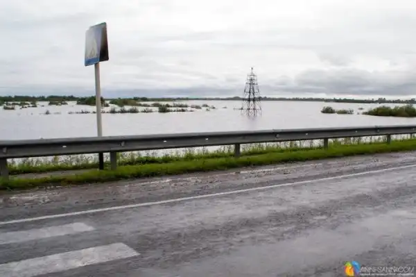 А там... настоящее амурское море. Река НЕ ЗАКАНЧИВАЕТСЯ даже спустя 9 километров от моста, на повороте на поселок Приамурский. До поселка Тельмана мы не доехали, но туда, как пишут в твиттере, можно добраться только по пояс в воде. Саму трассу может подтопить, вода достаточно близко.