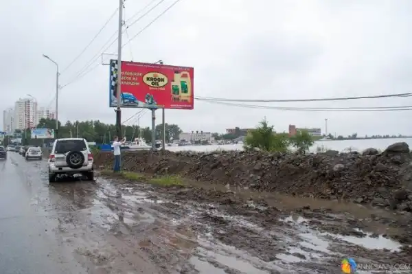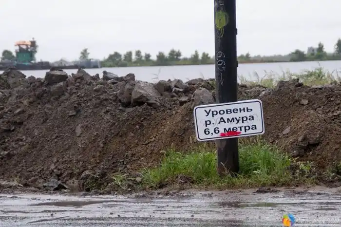 Судя по табличке, дамба здесь рассчитана на уровень Амура в 660 сантиметров с небольшим запасом, то есть либо ее сегодня еще укрепят, либо вода пойдет на дорогу?
