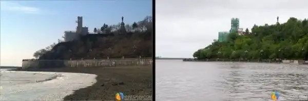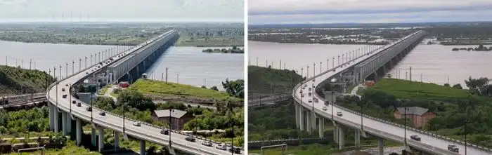 Наглядно видно, насколько разлилась вода на левом берегу при сравнении двух фото с одной и той же точки.
