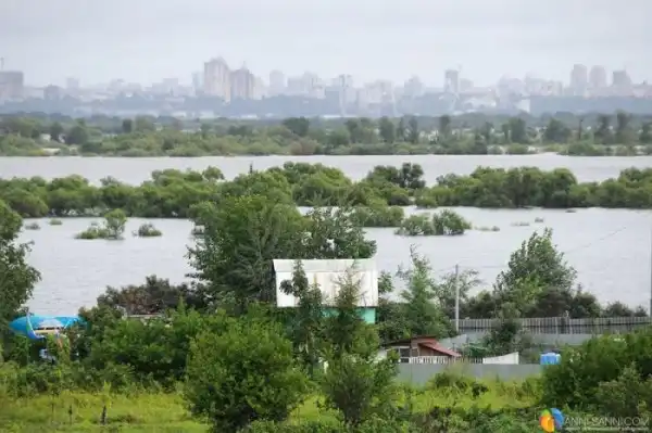 Там же - смотрим через поселки у левого берега (уже затопленная Владимировка и другие) смотрим на город за дымкой дождя.
