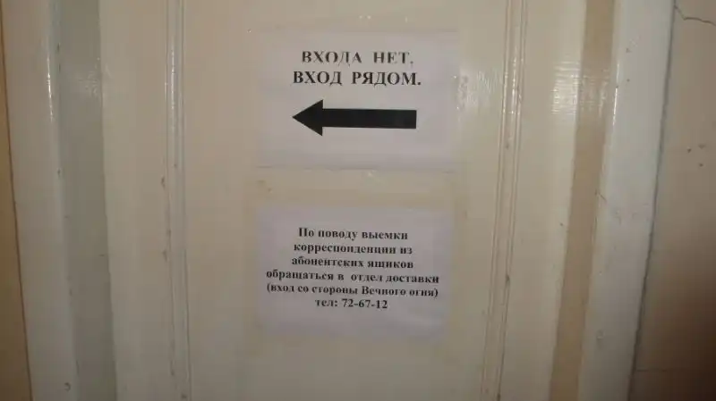 Занятная фотоистория о том, как одна женщина намеревалась попасть в отделение "Почты России". Чтобы добраться до заветного места выдачи посылок пришлось пройти настоящий квест, читая инструкции на стенах и прокладывая дорогу по указателям. Прямо дорога в царство теней какая-то.