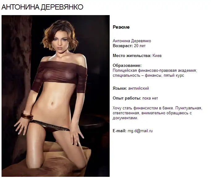 В журнале Максим, раньше была рубрика "Ищу работу" на последних страницах. Смысл в том, что к резюме девушкам делали эро-фотосессию. Несколько примеров ниже. Я так понимаю при таких фотках резюме особо не читают)