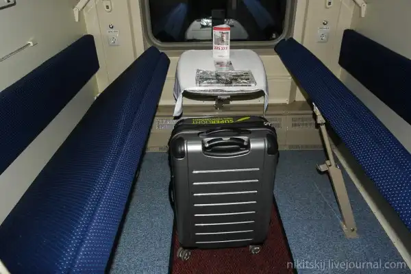 А вот и купе, в котором мне предстоит проехать 25 часов 19 минут. В нем отсутствует верхняя багажная полка, но мой немаленький чемодан успешно поместился вниз.