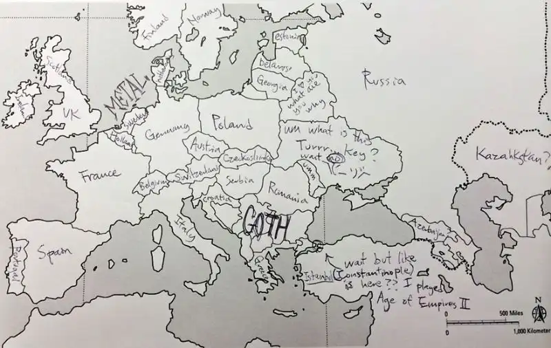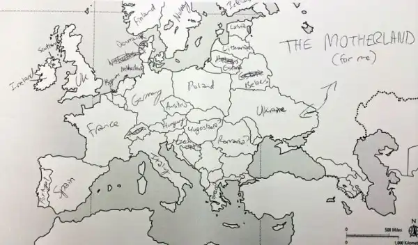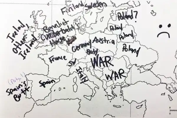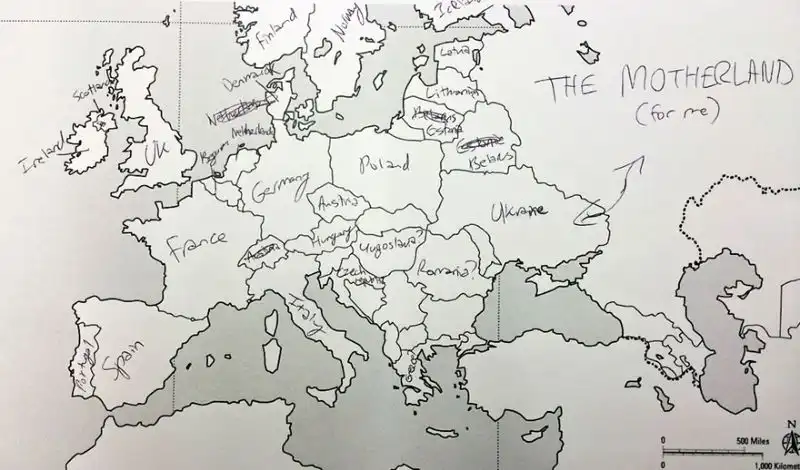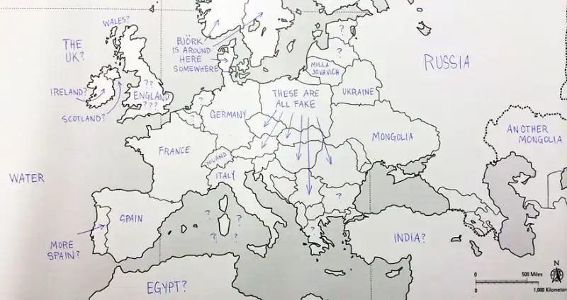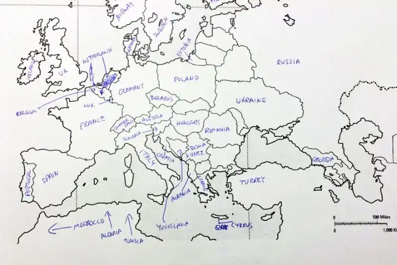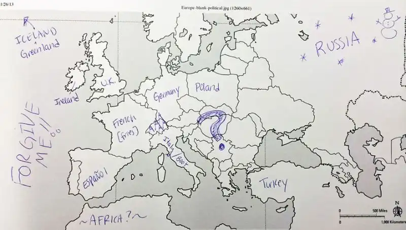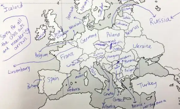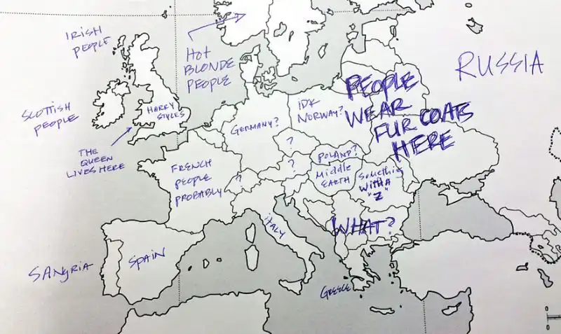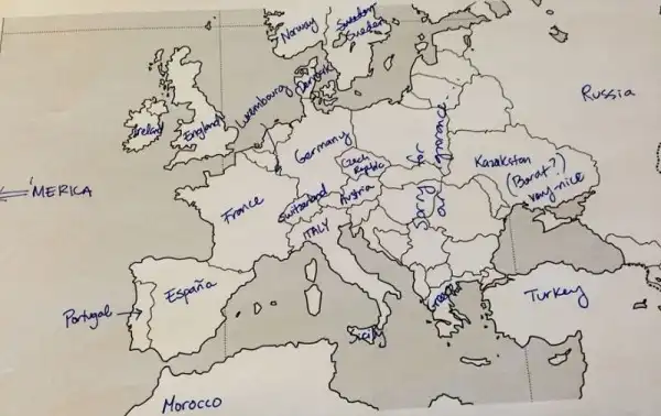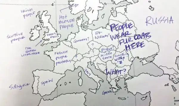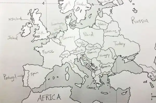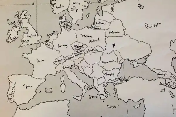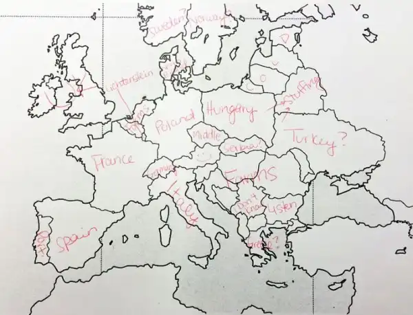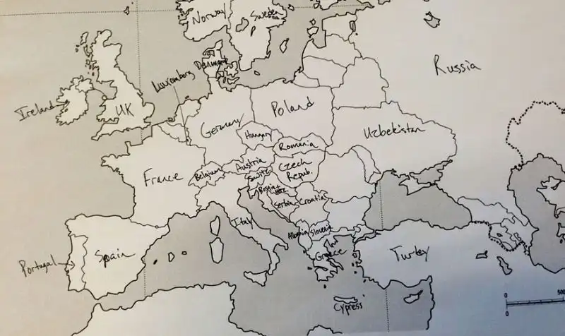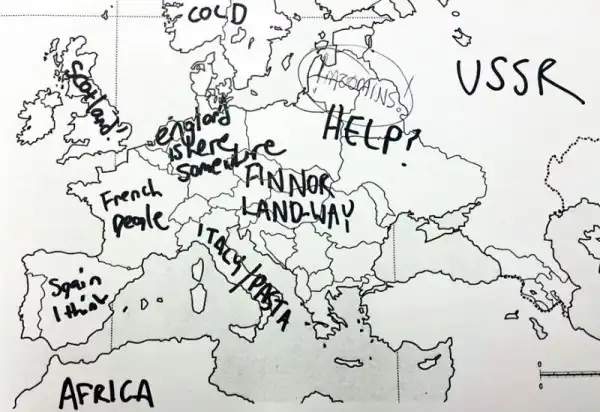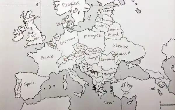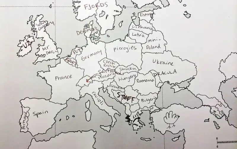 Небольшой эксперимент был поставлен в США. Один иностранный ресурс провел тест среди американцев на предмет знания географии. Участникам были розданы листики с контурной картой Европы, и от них требовалось подписать страны. Результаты впечатляют. Особенно порадовал чувак, обозначивший СССР.
