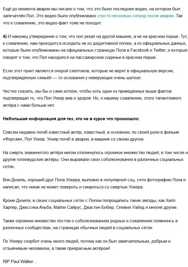 Слухи и опровержения гибели актера Пола Уокера