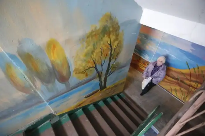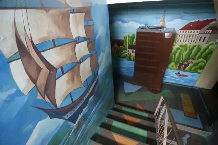 Варварские методы вызвали негодование всех соседей, которые почти десять лет собственными силами и на личные средства разукрашивали унылые стены в подъезде рисунками. Благодаря местной художнице на стенах появляются яркие городские пейзажи.