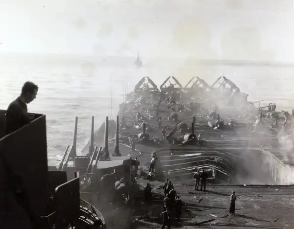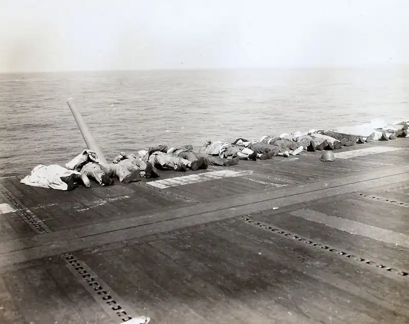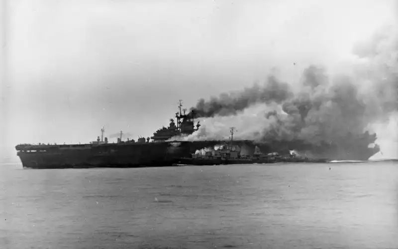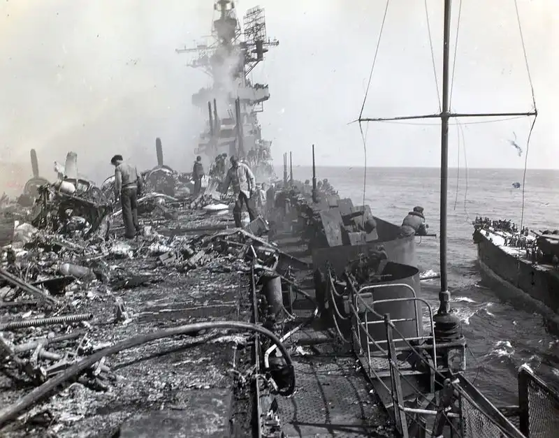 Горящий авианосец Банкер Хилл (CV-17) класса "Эссекс" после попадания двух камикадзе 11 мая 1945 года у Окинавы. По левому борту пришвартован эсминец "Чарльз Сперри" (USS Charles S. Sperry (DD-697)), который помогает экипажу авианосца бороться с огнем. Около носовых башен 127-мм орудий видны трубы легкого крейсера USS Wilkes-Barre (CL-103), принимающего раненых и также борющегося с огнем на "Банкер-Хилле".