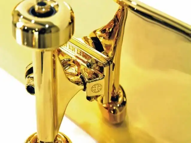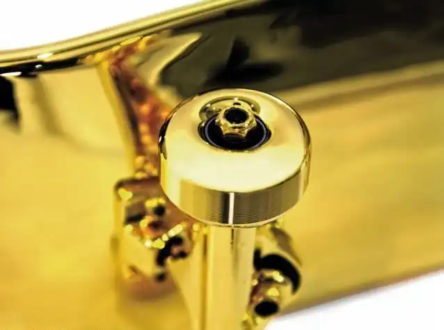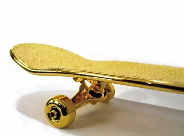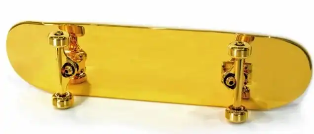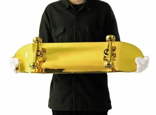 В продажу поступил уникальный скейтборд, покрытый золотом. Весит доска на 80 процентов больше обычной из-за драгоценного металла. Стоимость - 15 000 долларов с хвостиком.