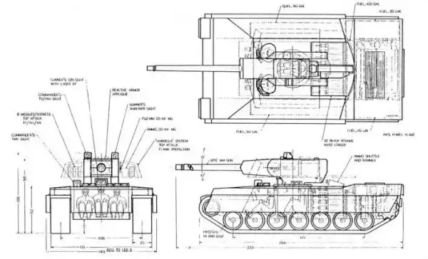 В средней части корпуса нового танка должна была размещаться башня с орудием, оснащенная комплектом автоматики. Последняя должна была осуществлять заряжание и наведение орудия по командам экипажа. Предложение о создании необитаемого боевого отделения подразумевало разработку оригинального автомата заряжания и ряда другого оборудования.