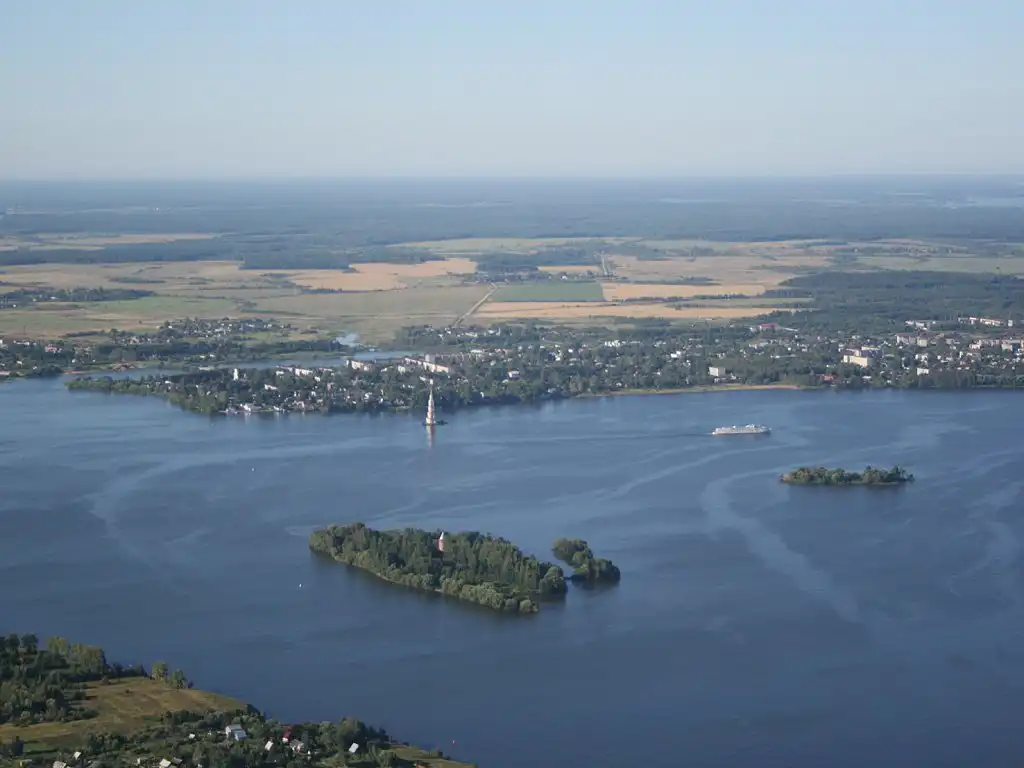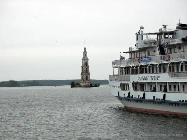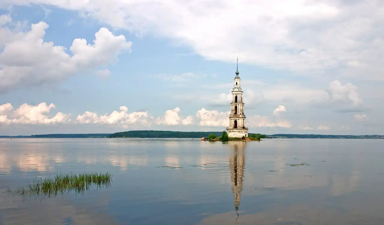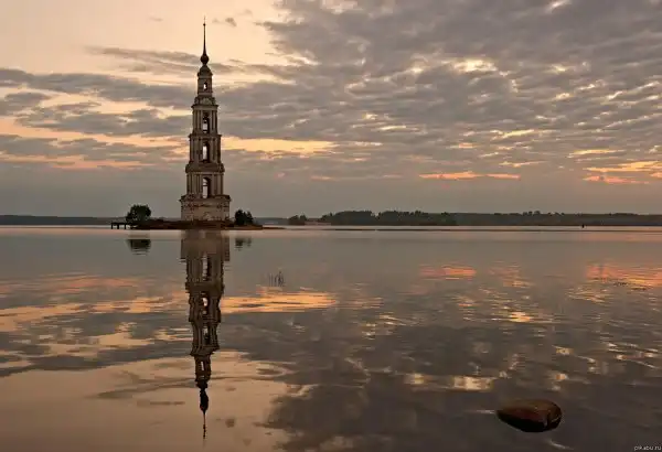 Сюрреалистическая картинка. Такого не может быть. Как ? Однако, это есть. В 180-и км от Москвы по Ярославскому и Дмитровскому шоссе на самом берегу реки Волги расположился небольшой город Калязин. На машине это займет часа 3 - 3,5. Подобно многим провинциальным городам России, сей град историю своего рождения связывает с созданием крепости-монастыря, вокруг которого разрослась слобода, а в последующем времени на противоположных сторонах реки возникли ещё две слободы, объединённые в 1775 г. между собой и получившие по указу императрицы Екатерины II; городской статус.
