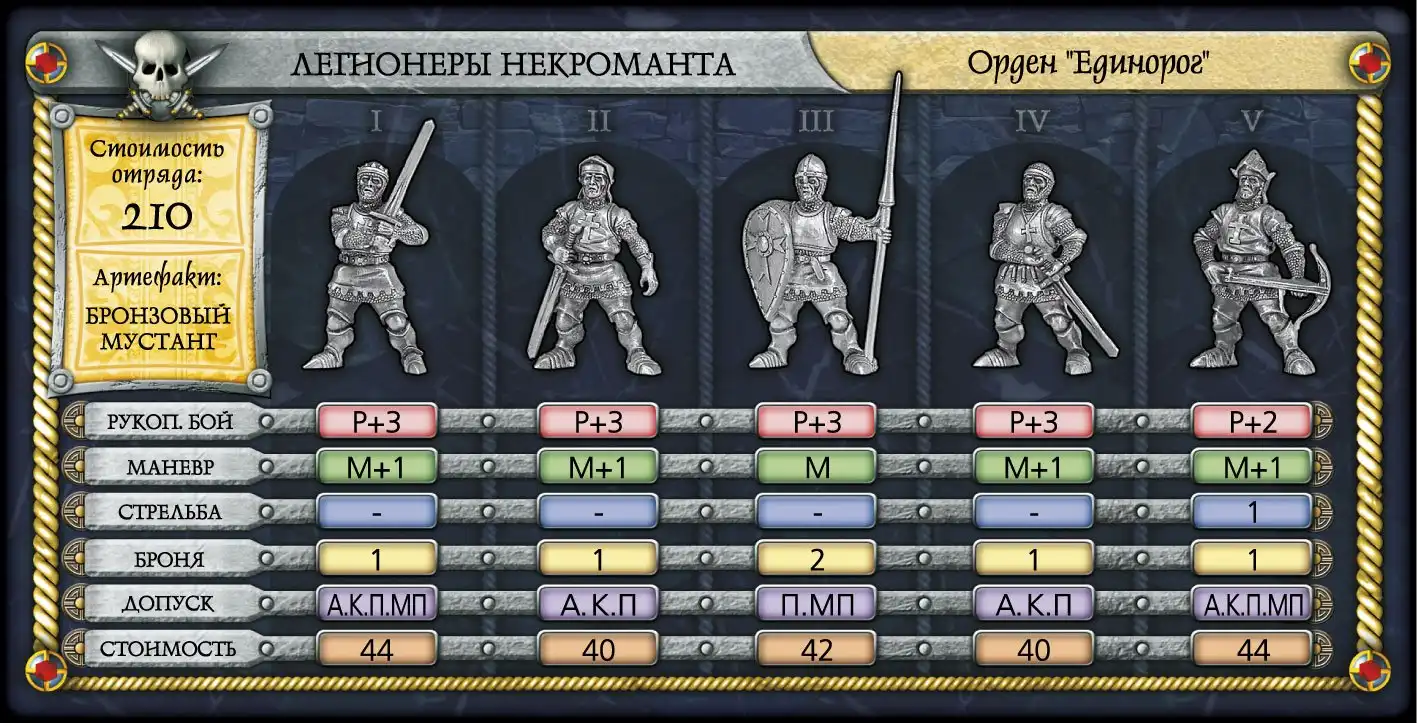 Каждый воин имеет допуск к типам орудий, защиту от магии, стоимость...