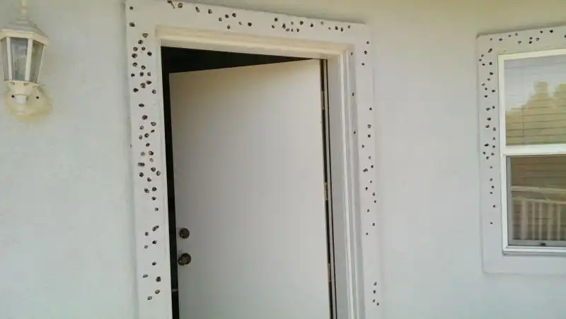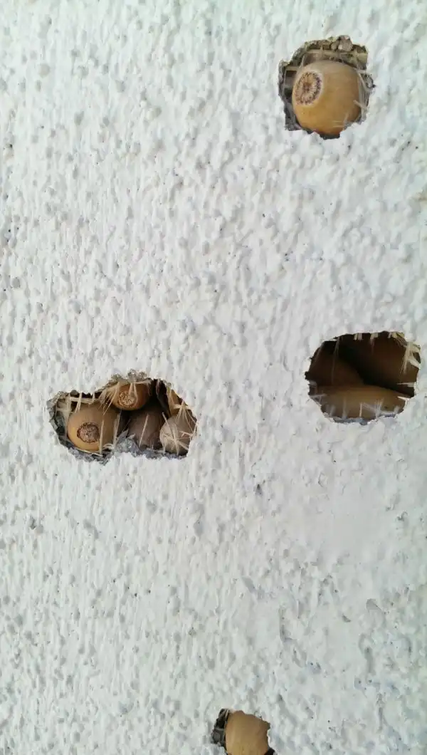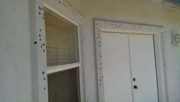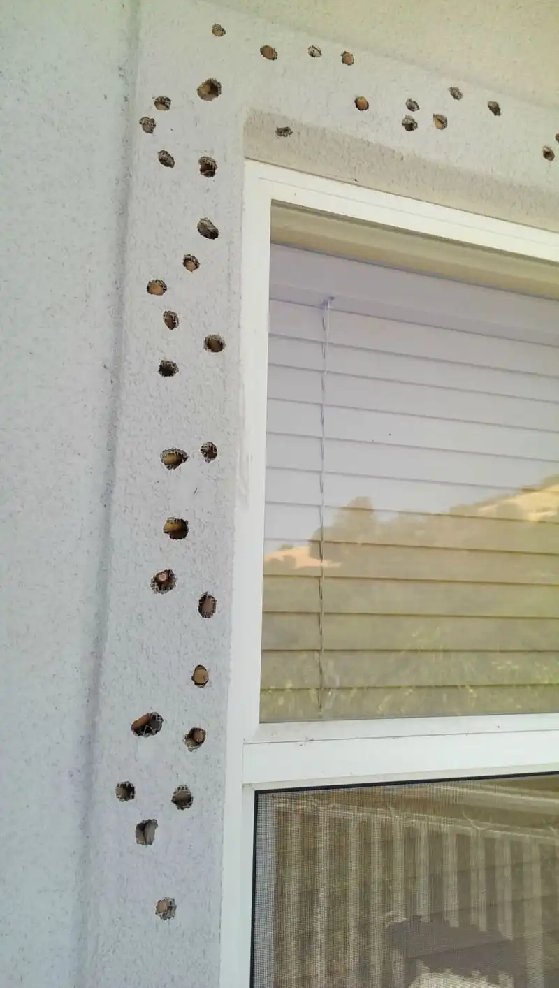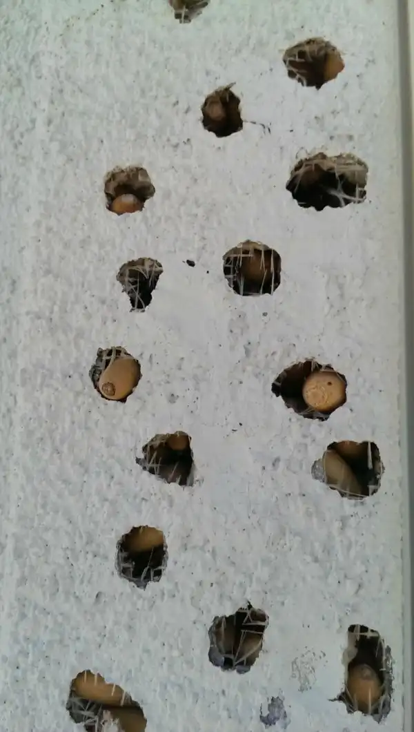 На заметку тем, что отделывает дом декоративной штукатуркой. Этот материал даже не выдерживает удара клюва дятла. При этом самим птичкам он почему-то очень нравится. У одного американца банда дятлов устроила в доме хранилище желудей. Запас на зиму готов. Теперь ждем белочек.