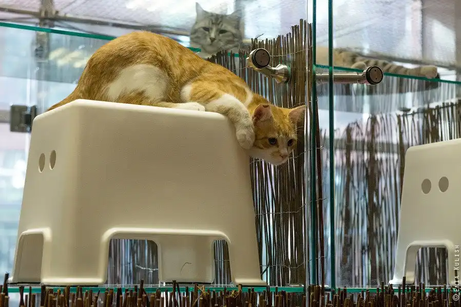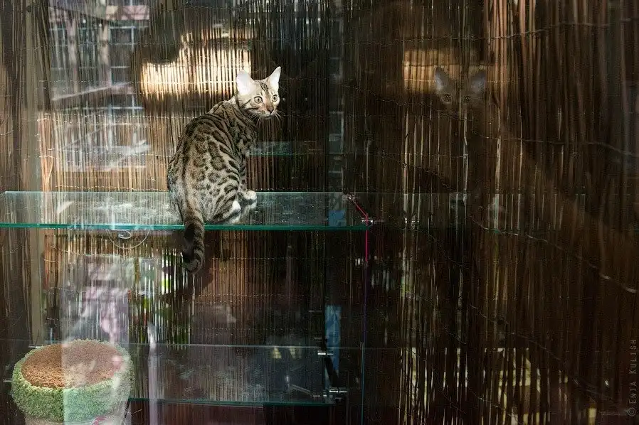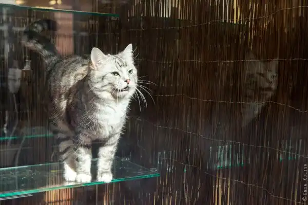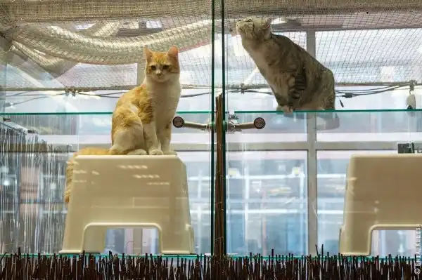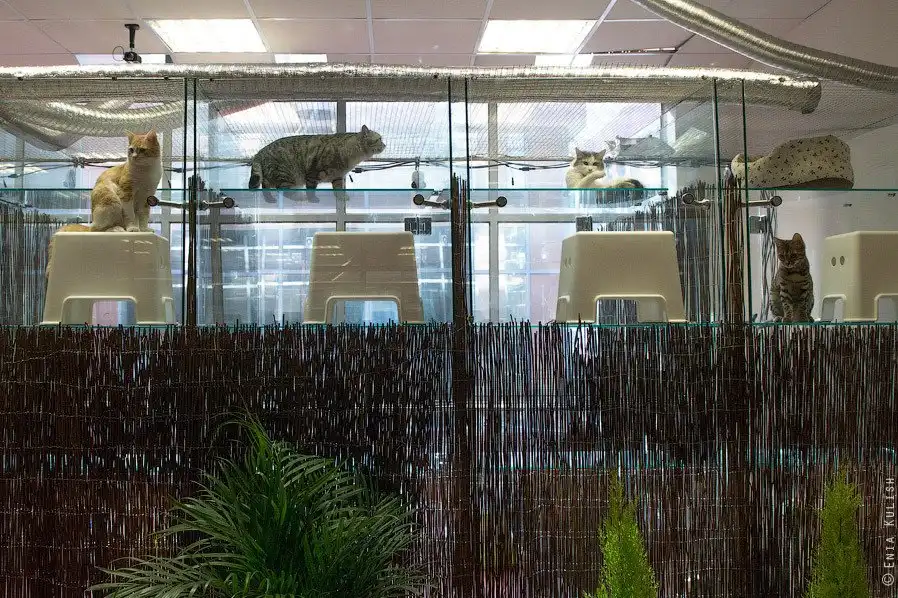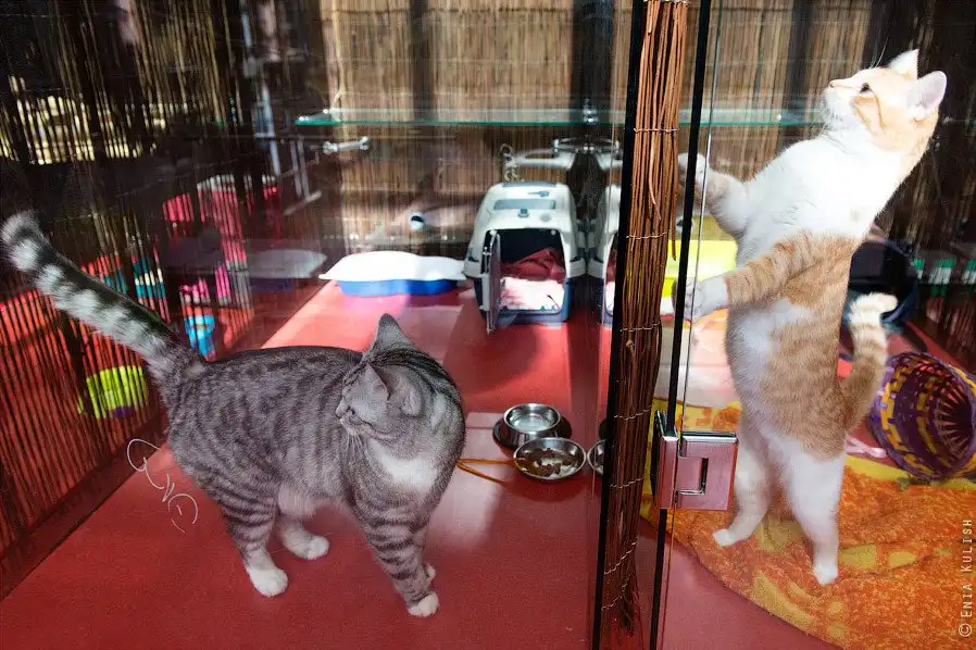 Коты здесь проживают в просторных номерах со стеклянными стенками. Стекло, казалось, бы, спорный вариант, но опыт его применения оказался очень удачным. С одной стороны, оно ограничивает кошачий номер, не отделяя его визуально от общего пространства. С другой — стороны он легко моется, что немаловажно.