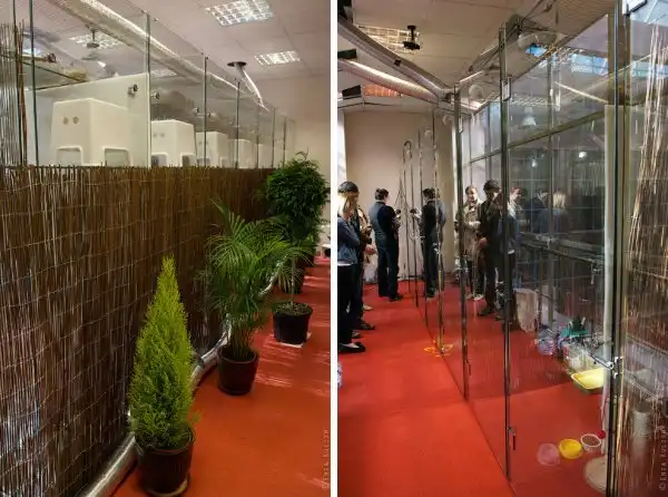 Чтобы у постояльцев была возможность уединиться, в нижней части номера-аквариумы отделены друг от друга декоративными ширмами. А сверху такого разделения нет, и котофеи имеют возможность общаться, но без прямого контакта.