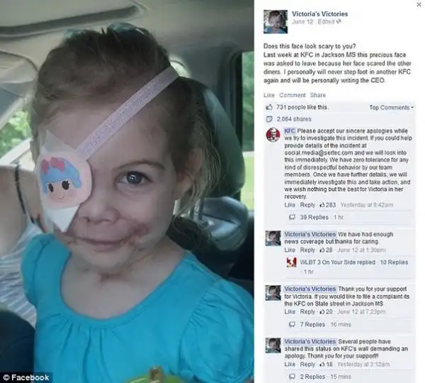 Бабушка девочки: «Мы были у врача, а затем заехали в ресторан KFC, так как Виктория была очень голодная. Я заказала сладкий чай и картошку пюре. В то время она питалась еще через специальную трубку, но я подумала, что пюре она сможет проглотить самостоятельно», — рассказывает бабушка. «Затем к нам подошли официанты и попросили покинуть ресторан, сославшись на то, что лицо девочки пугает посетителей». Девочка поняла, что им сказали, и всю дорогу домой проплакала.