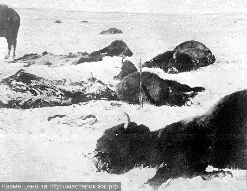 Особого размаха эта бойня достигла в 60-х годах при постройке железной дороги. Мало того, что мясом бизонов прокормили всю огромную армию рабочих, а шкуры продавали. Так называемая «охота» дошла до абсурда, когда от животных забирали только языки, а туши оставляя гнить.