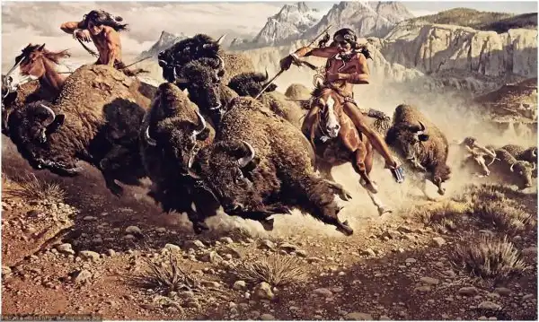 Археологи, проводившие раскопки на юге США, в штате Колорадо, обнаружили в одном из каньонов около двух сотен скелетов бизонов. Здесь восемь тысяч лет назад разбилось стадо диких быков. Часть добычи древние индейцы использовали, но к нескольким десяткам туш, как показало исследование, даже не притронулись. Многие историки считают, что в вымирании древних крупных животных повинен непосредственно охотник, вооруженный камнями и копьем. С помощью своего примитивного оружия он мог убить несколько мелких зверушек, но огонь и земной ландшафт помогали ему сотнями уничтожать крупных зверей. Подобные способы охоты вкупе с периодически возникающими эпидемиями среди животных и частыми засухами рано или поздно привели бы бизонов к вымиранию. Но белым пришельцам удалось во много раз ускорить этот страшный процесс.