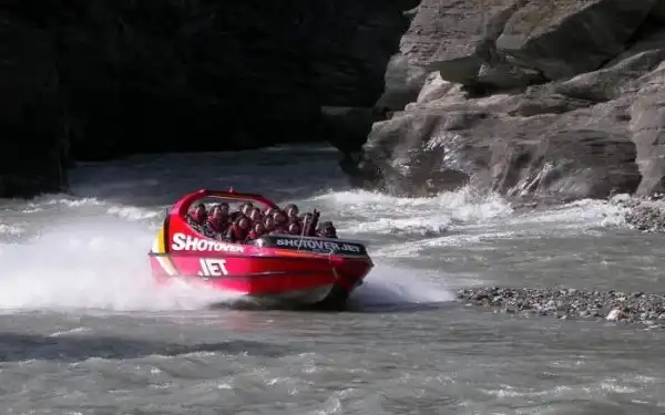 А в новозеландском городе Квинстауне самым популярным аттракционом является скоростной проход на катере по узкой и опасной горной реке. Каменистое дно, пороги, резкие повороты, нависающие скалы и мелководье (на некоторых участках маршрута глубина не превышает 10 сантиметров) — всё это усиливает ощущения от экстремального аттракциона «Шотовер Джет». Добавляет напряженности вертолет, с высоты контролирующий успешность прохождения маршрута. Финальную точку водитель катера ставит в конце маршрута, резко разворачивая катер на 360 градусов.