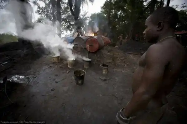 К примеру, в маленькой деревушке Опокмалела в 50 км от Порта Харкорт около 30 человек «облюбовали» нефтевышку компании «Shell» в мангровых лесах. И днем и ночью они по пояс голые копаются в грязи, чтобы добыть нефть, которую они потом продают иностранным покупателям по цене 3 евро за баррель.