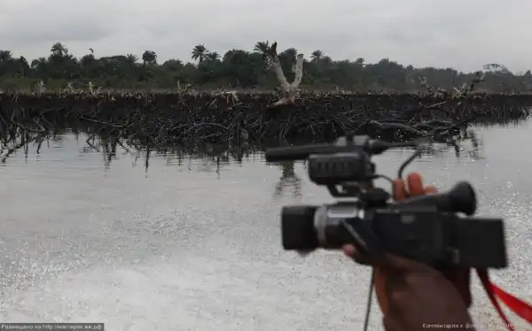 20 июня 2010 года. Оператор снимает мангровые леса около Бодо-сити, уничтоженные разлившейся нефтью. AP Photo/Sunday Alamba